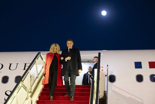 12月3日,马克龙(右)和妻子布丽吉特抵达北京 图源:新华社