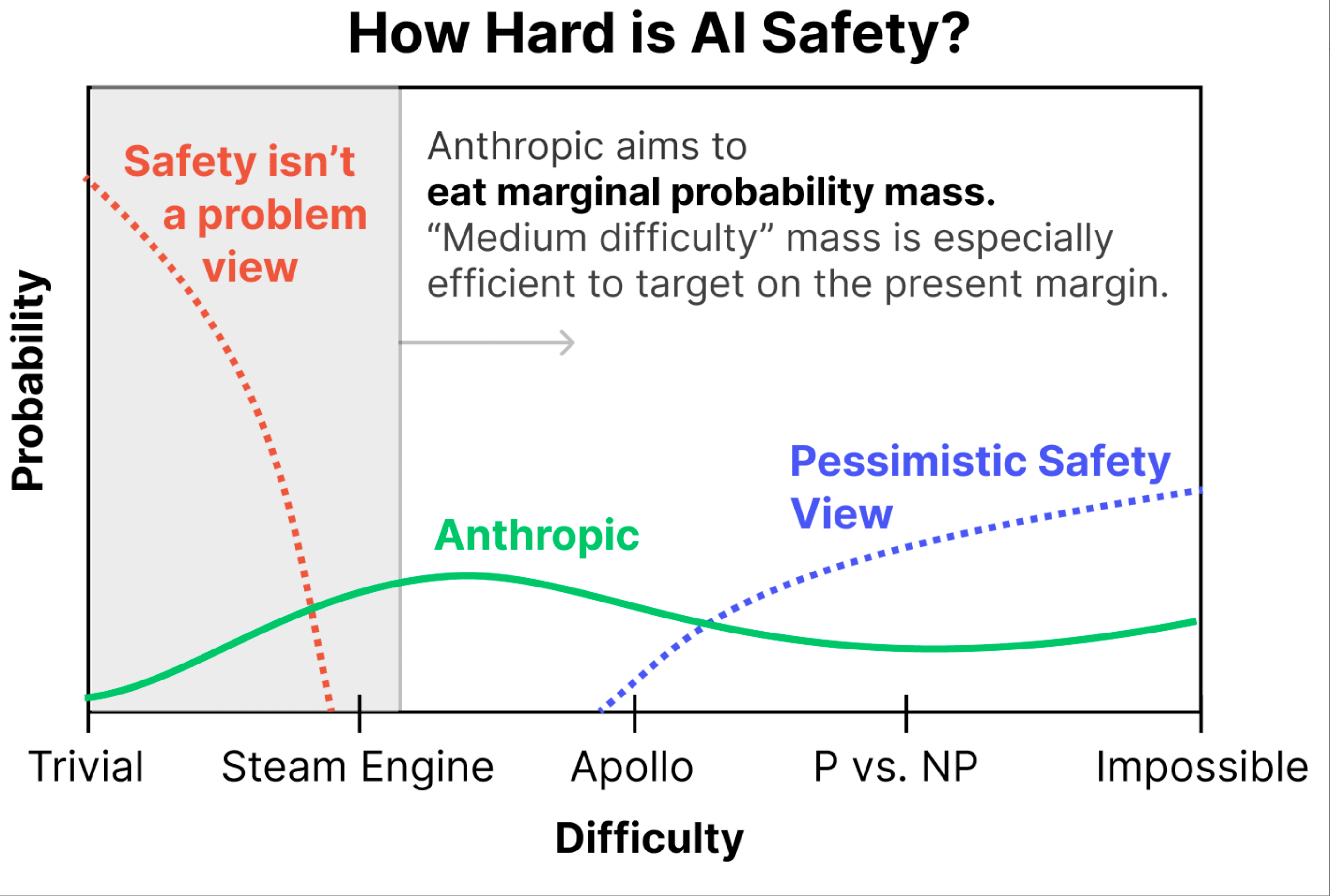 ▲Anthropic 在 2023 年提出的,实现 AI 安全有多难的图表,横轴代表难度,从琐碎简单、到蒸汽机、阿波罗登月计划、解决 P 和 NP 问题、以及不可能;纵轴代表可能性。三种不同的颜色分别代表不同观点,绿色是 Anthropic 认为实现 AI 安全难度在中等,橙色代表 AI 安全不是一个问题,蓝色代表实现 AI 安全及其困难。