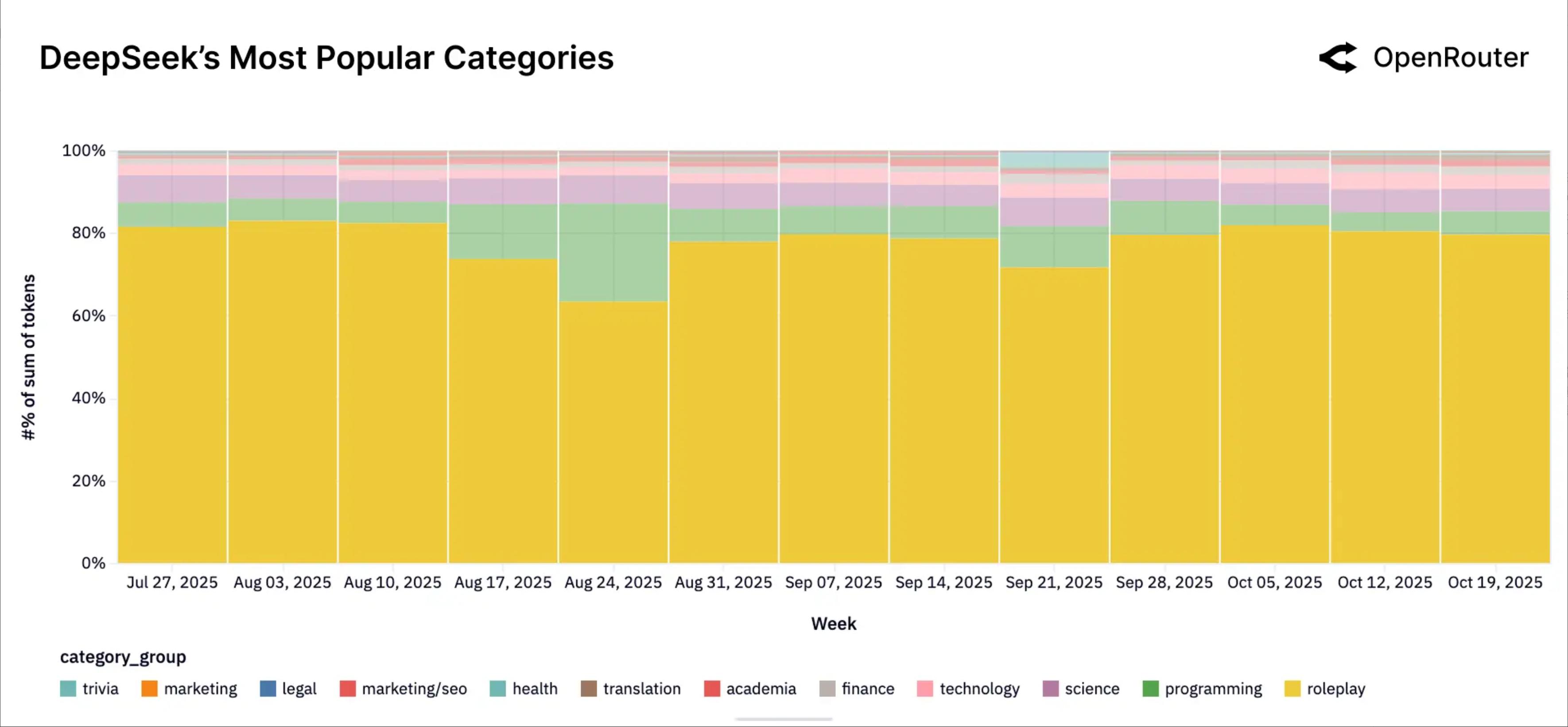▲通过 OpenRouter 平台数据和分析 DeepSeek 的 Token 使用模式,角色扮演(黄色)的用途,几乎在过去一个季度占据了 80% 的使用量