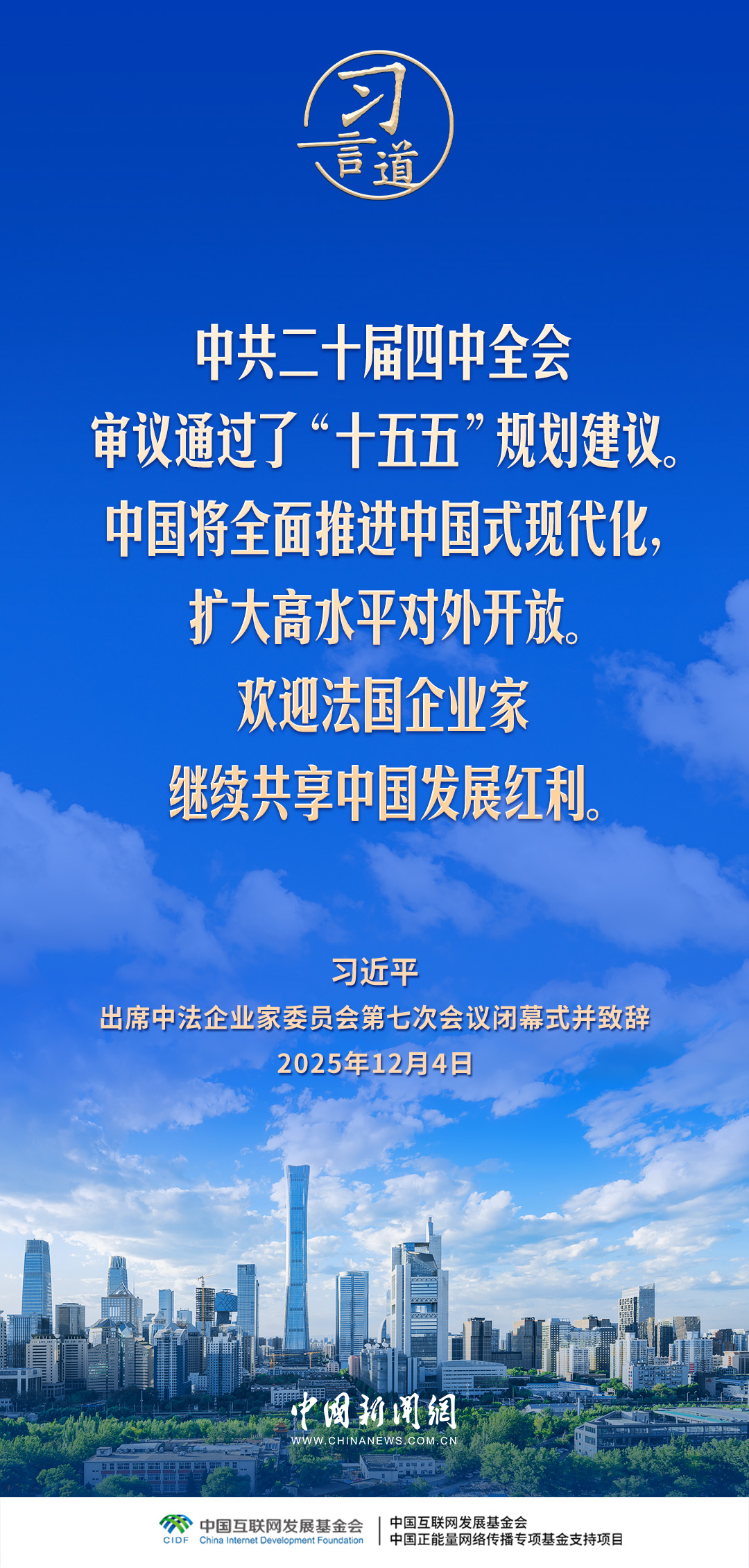 12月4日,国家主席习近平在北京同法国总统马克龙共同出席中法企业家委员会第七次会议闭幕式并致辞。习近平指出——